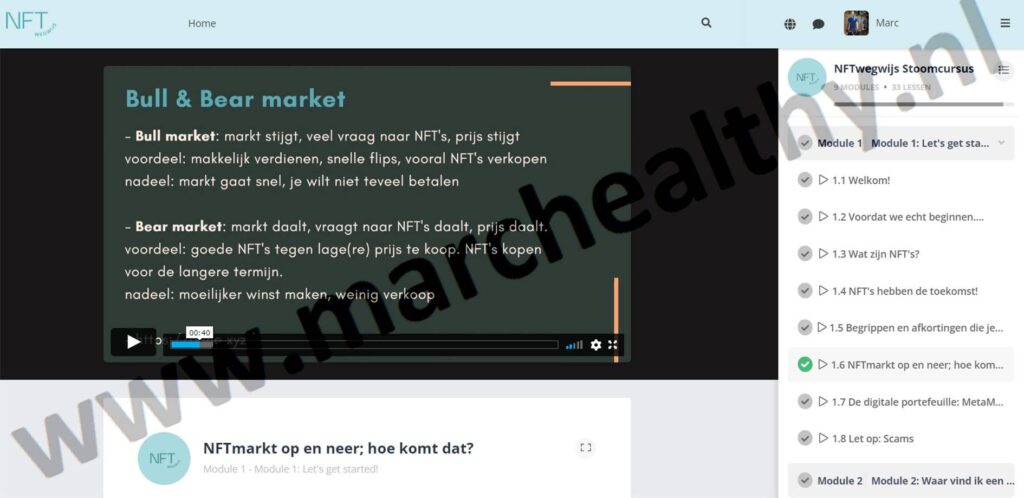 Zoals je de afbeelding kunt zien is het ook erg persoonlijk want je ziet Maarten Oostland zelf en hij neemt je echt stap voor stap mee door het proces van NFT’s. Van een goede basis over NFT’s, hoe je ze kunt kopen en verkopen en Maarten leert je zelfs hoe je NFT’s kunt maken en ook dit laat hij je stap voor stap zien.