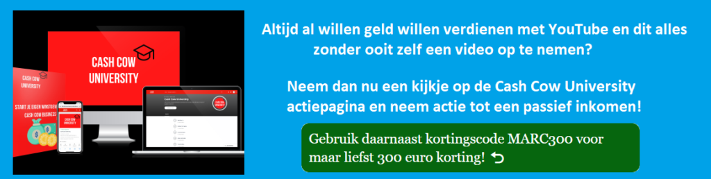 Wil jij leren hoe je een passief inkomen kan verdienen met YouTube zonder zelf video’s te maken en je gezicht te laten zien? Wacht dan niet langer en ga nu aan de slag met de Cash Cow University en gebruik mijn kortingscode MARC300 voor maar liefst 300 euro korting!