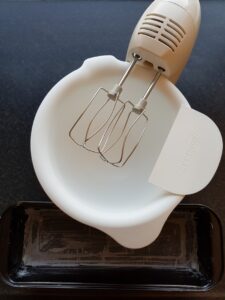 Vet de cakevorm in. Wat makkelijk is om er een strook bakpapier onderin te leggen. Dit zorgt ervoor dat we het brood er straks met veel gemak uit te krijgen is. Giet de mix in de cakevorm.