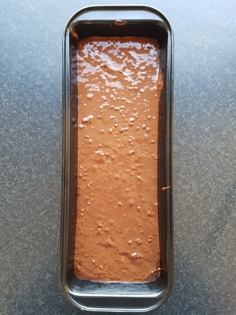 Vet de cakevorm in. Wat makkelijk is om er een strook bakpapier onderin te leggen. Dit zorgt ervoor dat we het brood er straks met veel gemak uit te krijgen is. Giet de mix in de cakevorm.