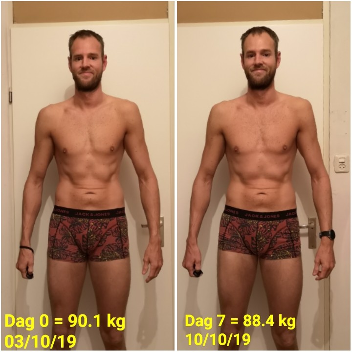 Doordat ik in ketose zit, zal ik veel minder vocht vast houden. Daar zorgen koolhydraten normaal voor. Hierbij de foto’s van dag 0 & dag 7
