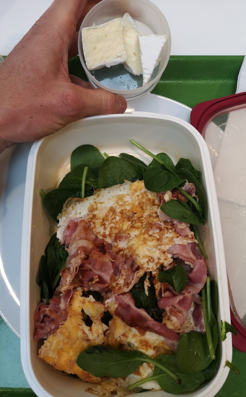 Mijn eerste maaltijd is gebakken ontbijtspek, gebakken eieren en groente groentes (spinazie)