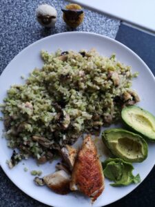 Vanavond eten we broccolirijst met champignons en een stuk kalkoenfilet met een avocado.