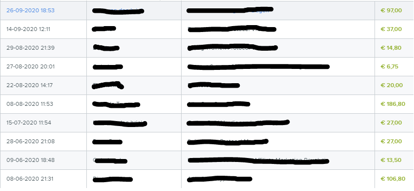 De commissies variëren tussen de 3% en 12% per verkoop. Hieronder een voorbeeld van afgelopen maand, zoals je ziet zijn het relatief kleine bedragen maar genoeg om je website te onderhouden.