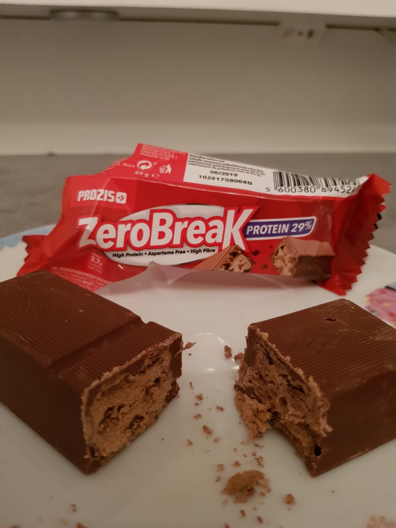 Een echte aanrader! Om dan maar gelijk te vergelijken met een echte Kitkat, daarin zitten 3.2 gram eiwitten tegenover 14.2 gram in deze bar. Calorieen zijn hetzelfde.
