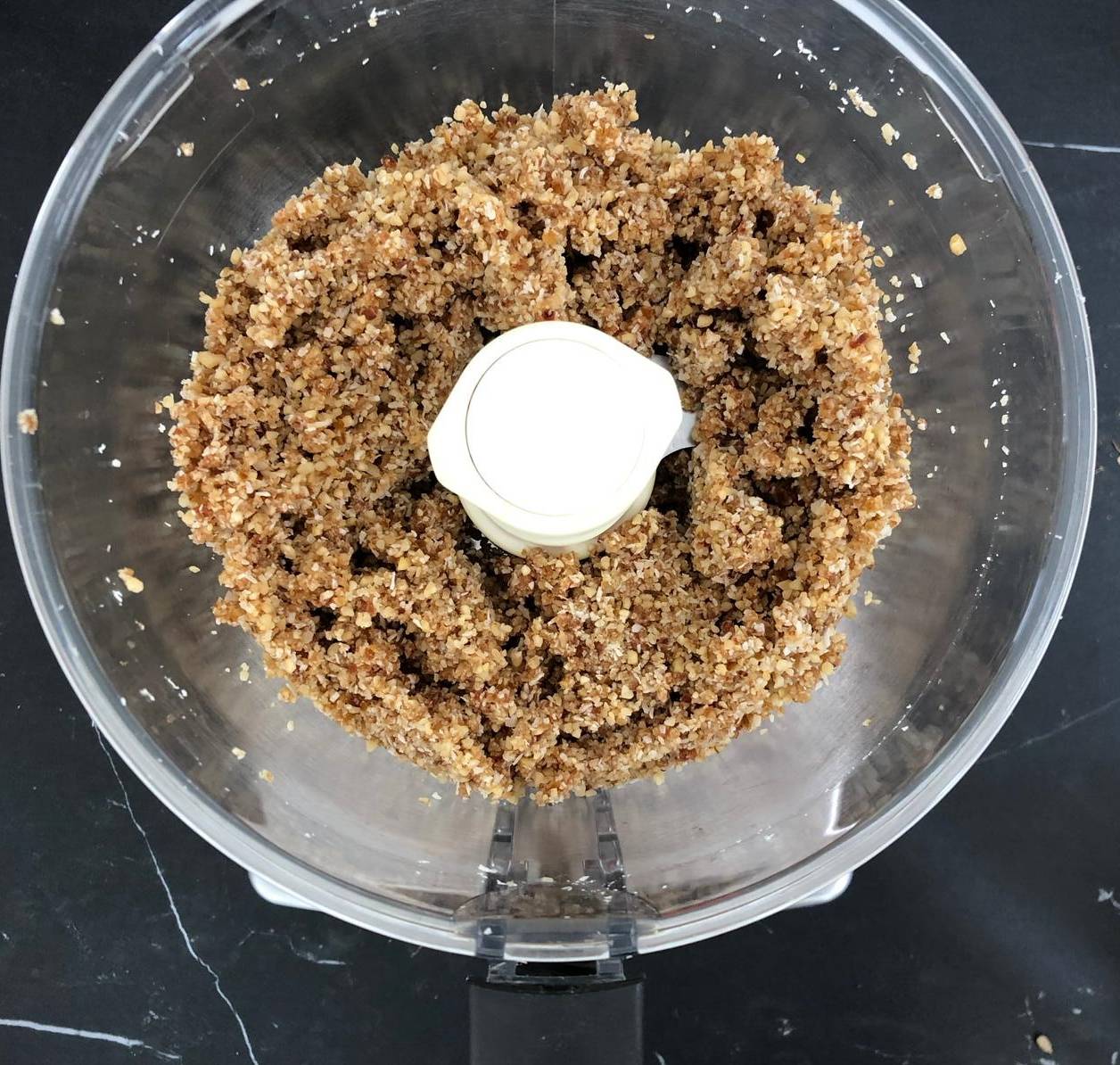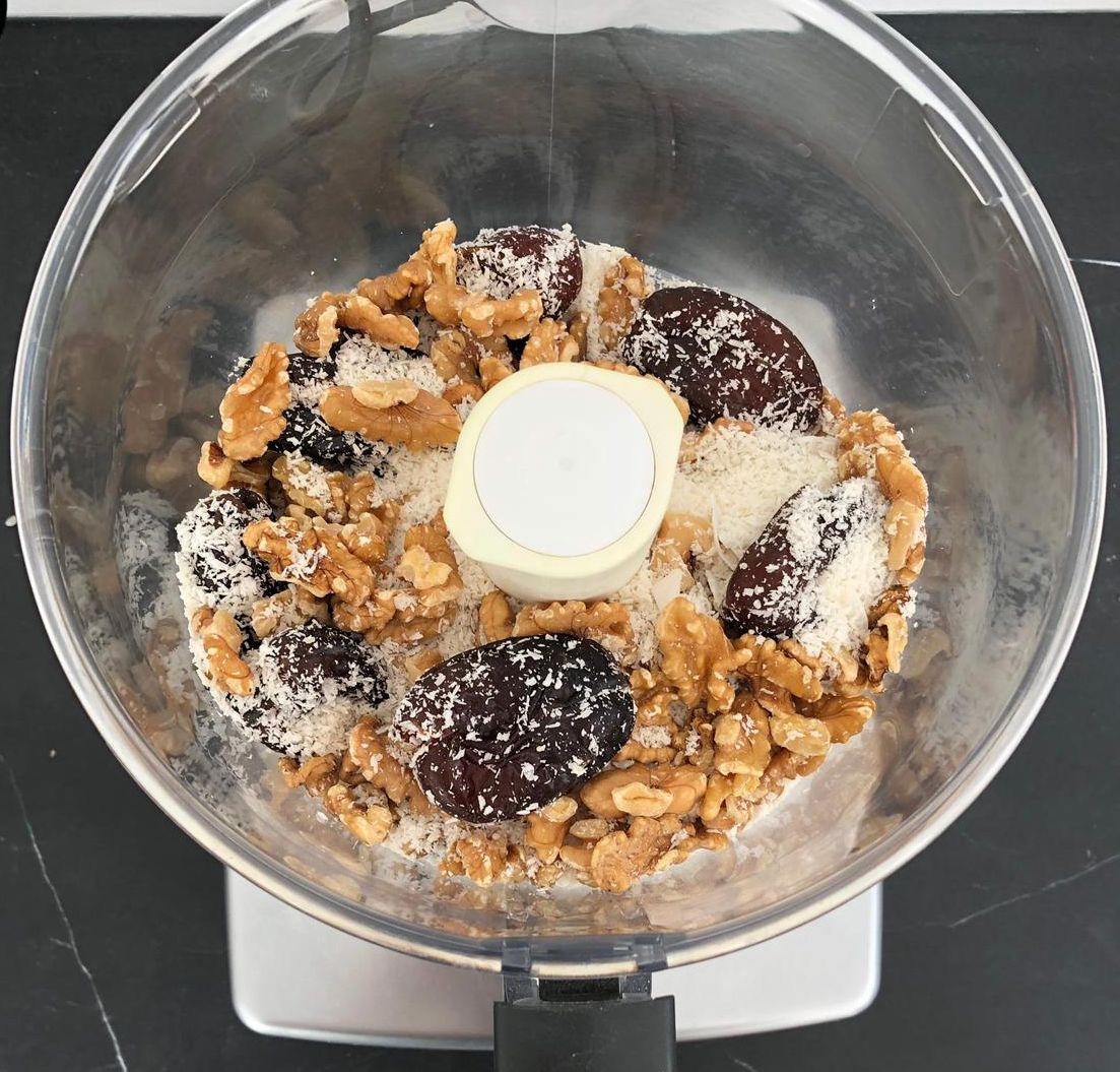 Doe de dadels, walnoten en 75 gram kokosrasp in de keukenmachine en mix tot alle ingrediënten aan elkaar plakken.