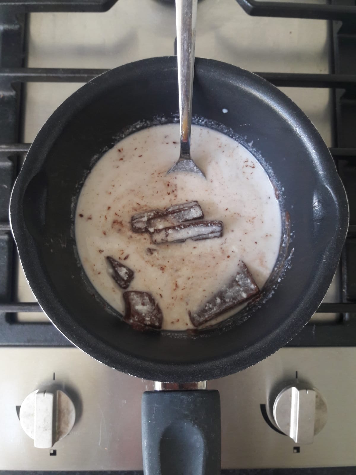 Giet de overige 200 ml kokosmelk in een steelpannetje en verwarm. Breek vervolgens de chocolade in stukjes en roer deze door de de kokosmelk totdat deze volledig is gesmolten.