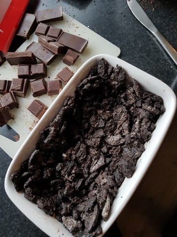 Giet de chocolade vulling over het mengsel en werk het af met enkele gehalveerde Oreo’s.