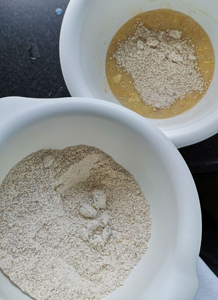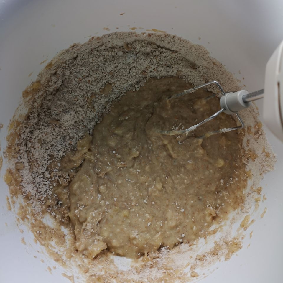 Voeg in stappen de droge bestanddelen aan het bananenmengsel toe.