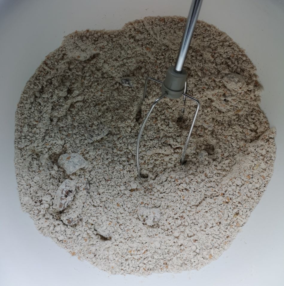 Meng in een grote kom het speltmeel, de kokosrasp, havermout oats, bakpoeder, kaneel en de walnoten