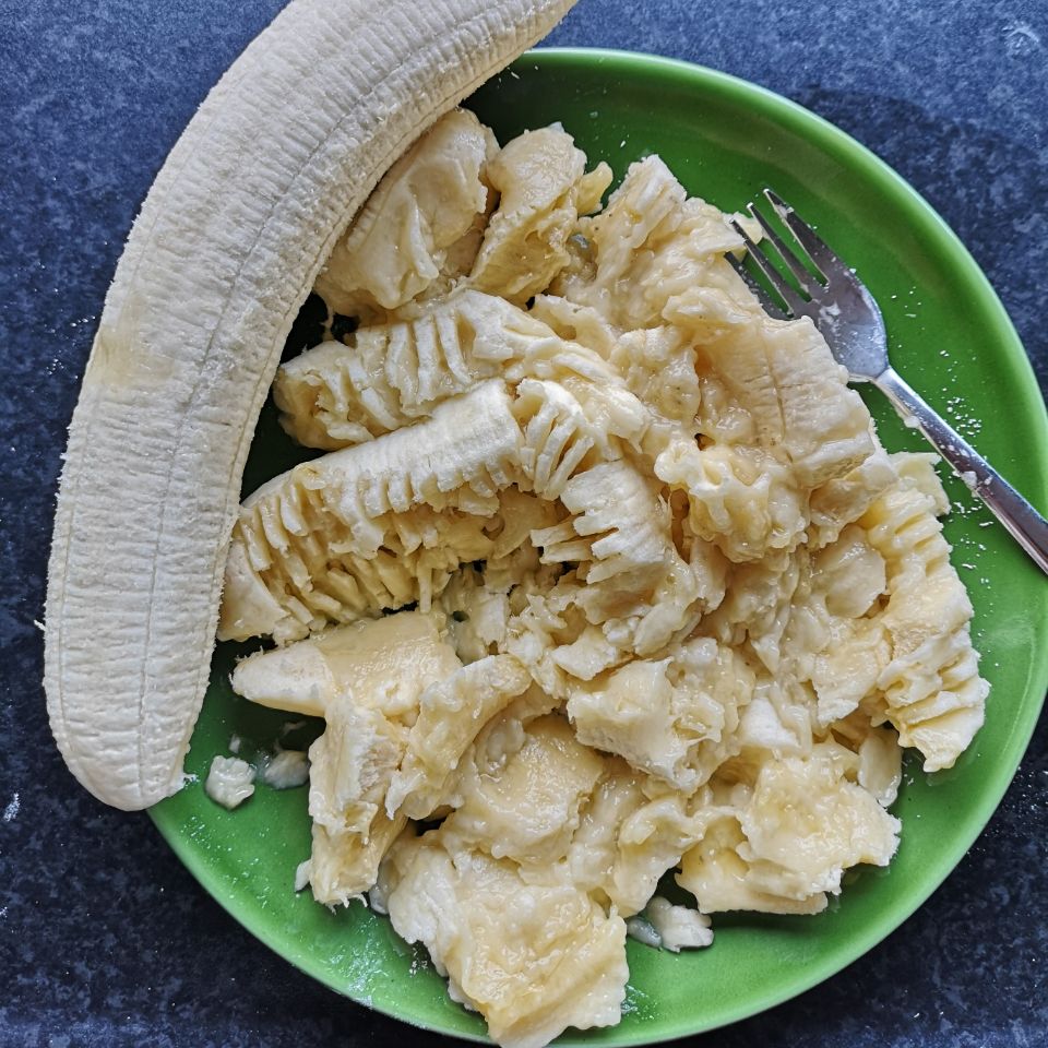 Voeg vervolgens de bananen, melk, ahornsiroop, kokosolie en het vanille-suiker in een blender of zoals hier in een bak. Meng het tot een geheel.