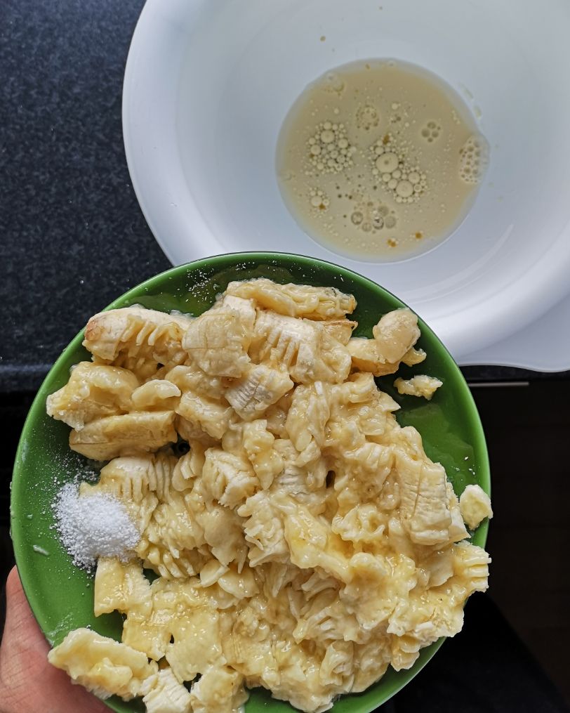 Voeg in stappen de droge bestanddelen aan het bananenmengsel toe.