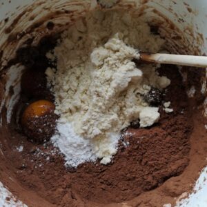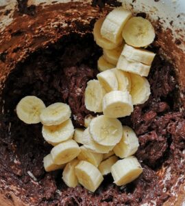 Als laatste voeg de je gesneden bananen toe en mix het tot 1 geheel eventueel met een keukenmachine, anders met de mixer.
