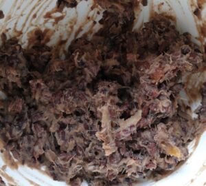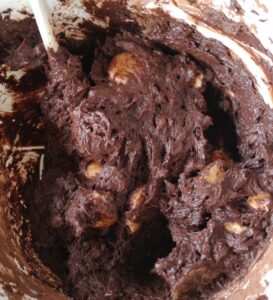 Als laatste voeg de je gesneden bananen toe en mix het tot 1 geheel eventueel met een keukenmachine, anders met de mixer.