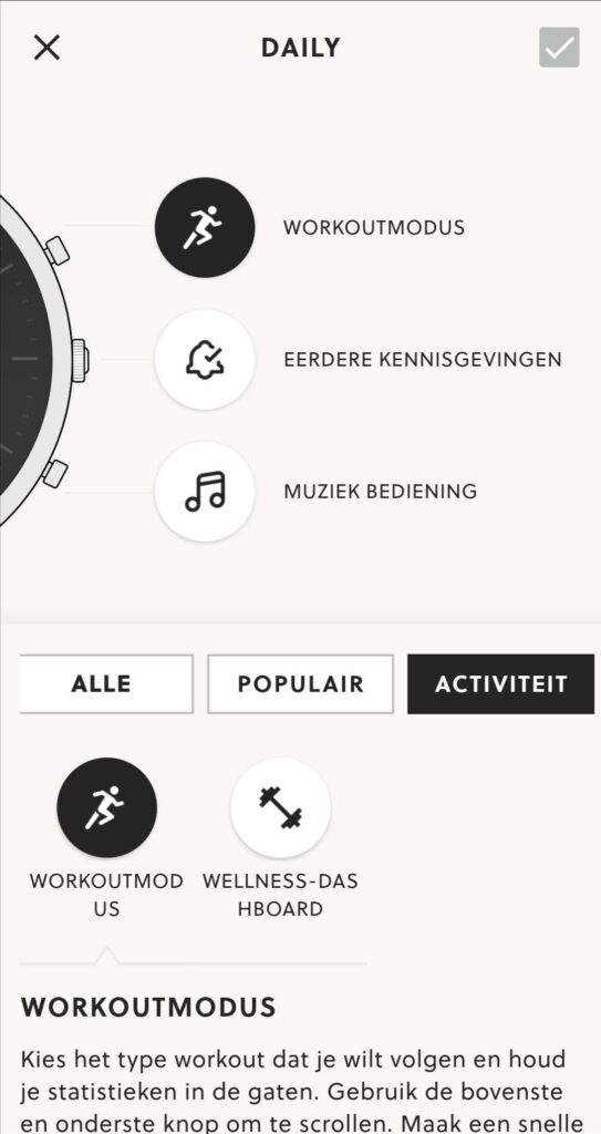 Extra opties zitten er eigenlijk niet op, geen stopwatch of timer of een functie zoals “find my smartphone” die de Huawei Watch GT wel heeft.