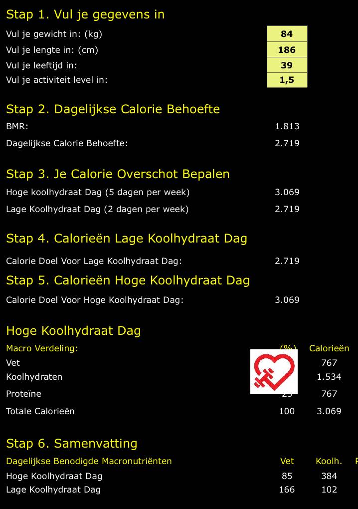Je krijgt toegang tot een Excel Macrocalculator, dit is een sheet die je voor altijd kunt gebruiken en daarin worden je macro’s altijd aangepast als je gewicht anders wordt.