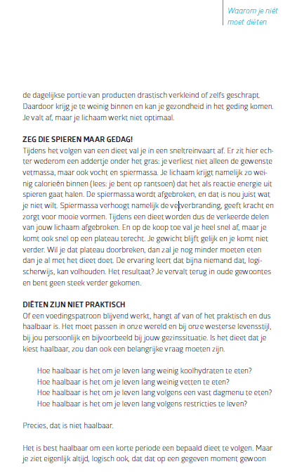 Weer een goed beschreven hoofdstuk. Om mij heen (collega’s of bekenden) zie ik veel verschillende diëten toepassen waarbij heel weinig calorieën of heel weinig koolhydraten worden gegeten.