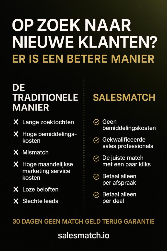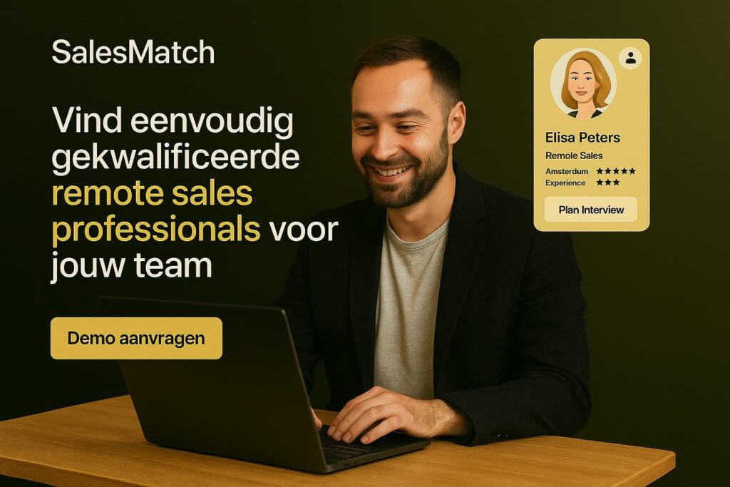 SalesMatch biedt namelijk een oplossing voor dit probleem. Dit platform helpt je om gekwalificeerde verkoopprofessionals te vinden die op afstand werken. Je betaalt alleen bij succes dankzij hun ‘No Cure No Pay’ model. Zo loop je geen financieel risico.