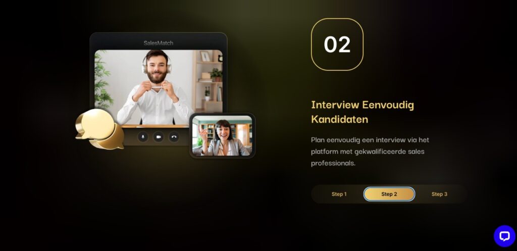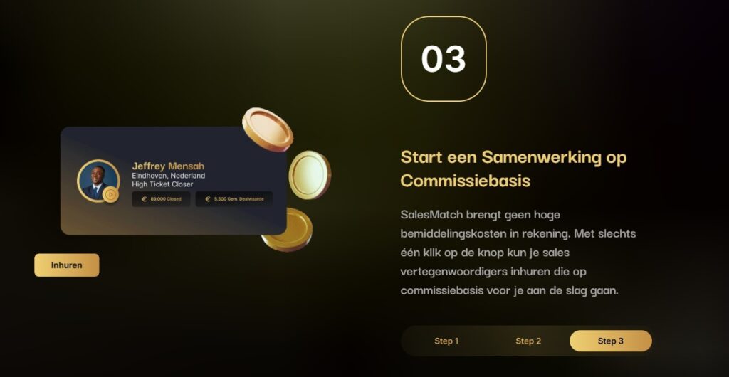 - Het platform werkt met een simpel drie-stappen proces voor het vinden van sales talent.