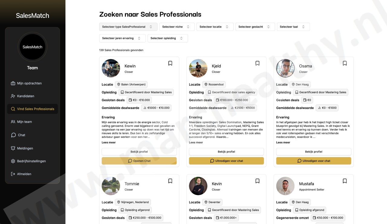 - Het matchingsysteem koppelt je aan sales closers met de juiste vaardigheden voor jouw product.