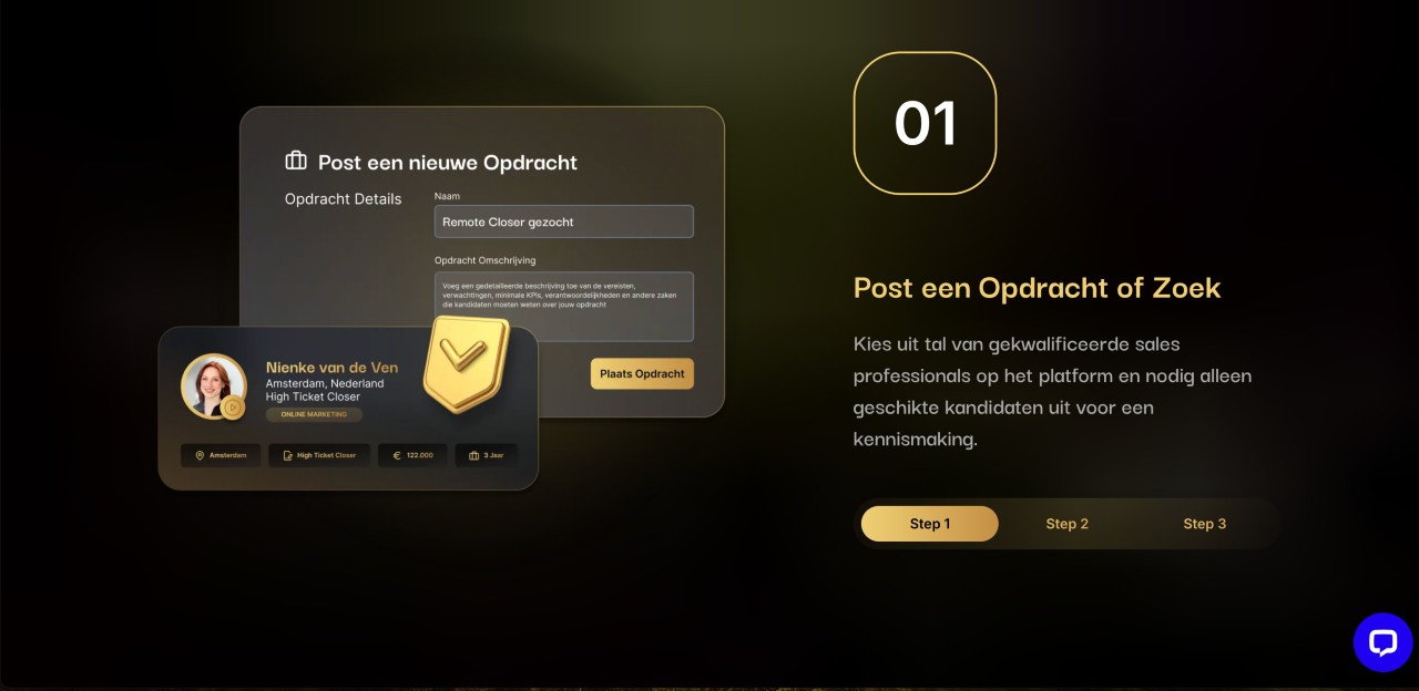 Na registratie kun je direct opdrachten verstrekken aan potentiële kandidaten. Je post simpelweg je opdracht op het platform of zoekt zelf naar geschikte sales professionals. Het platform toont alleen mensen die passen bij jouw behoeften.