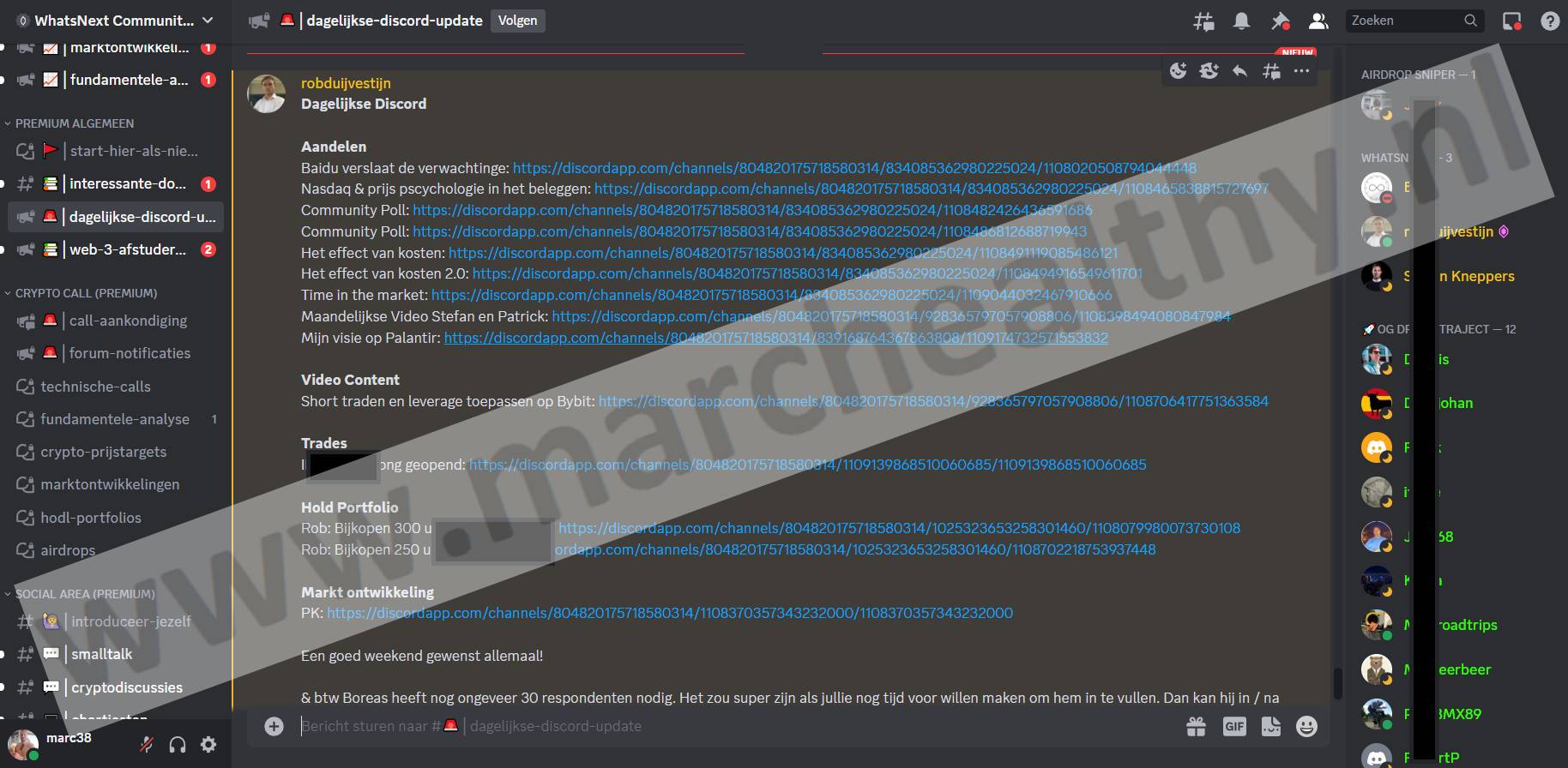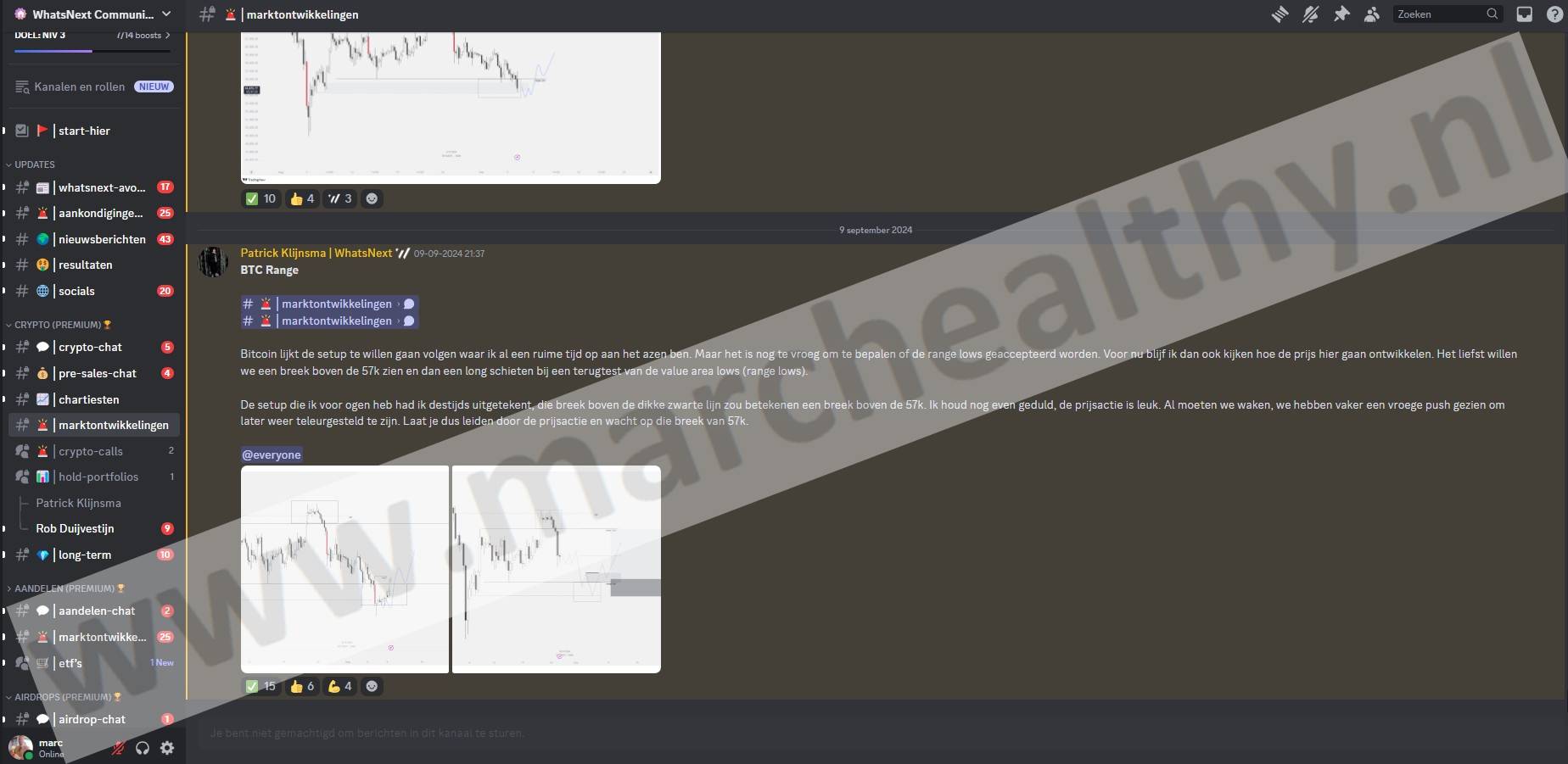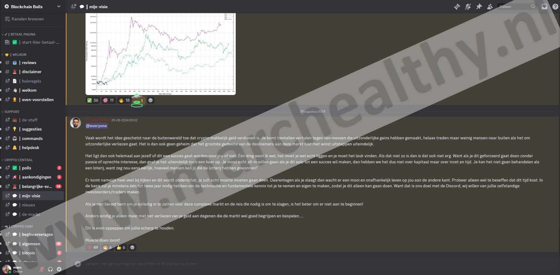 In de premium Discord vind je dagelijks updates over de markt. Je ziet welke munten kansrijk zijn en waarom. Ook krijg je uitleg over interessante documenten in de crypto wereld. Zo blijf je altijd op de hoogte van de laatste ontwikkelingen.