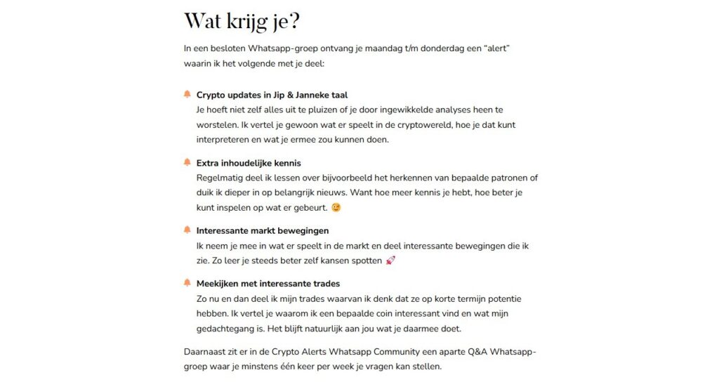 Crypto Alerts is een dienst van Tineke Zwart. Ze geeft tips over crypto’s. Haar doel is om jou te helpen geld te verdienen met digitale munten. Je krijgt toegang tot een speciale groep via whatsapp. Daar deelt Tineke haar kennis en ideeën over de markt.